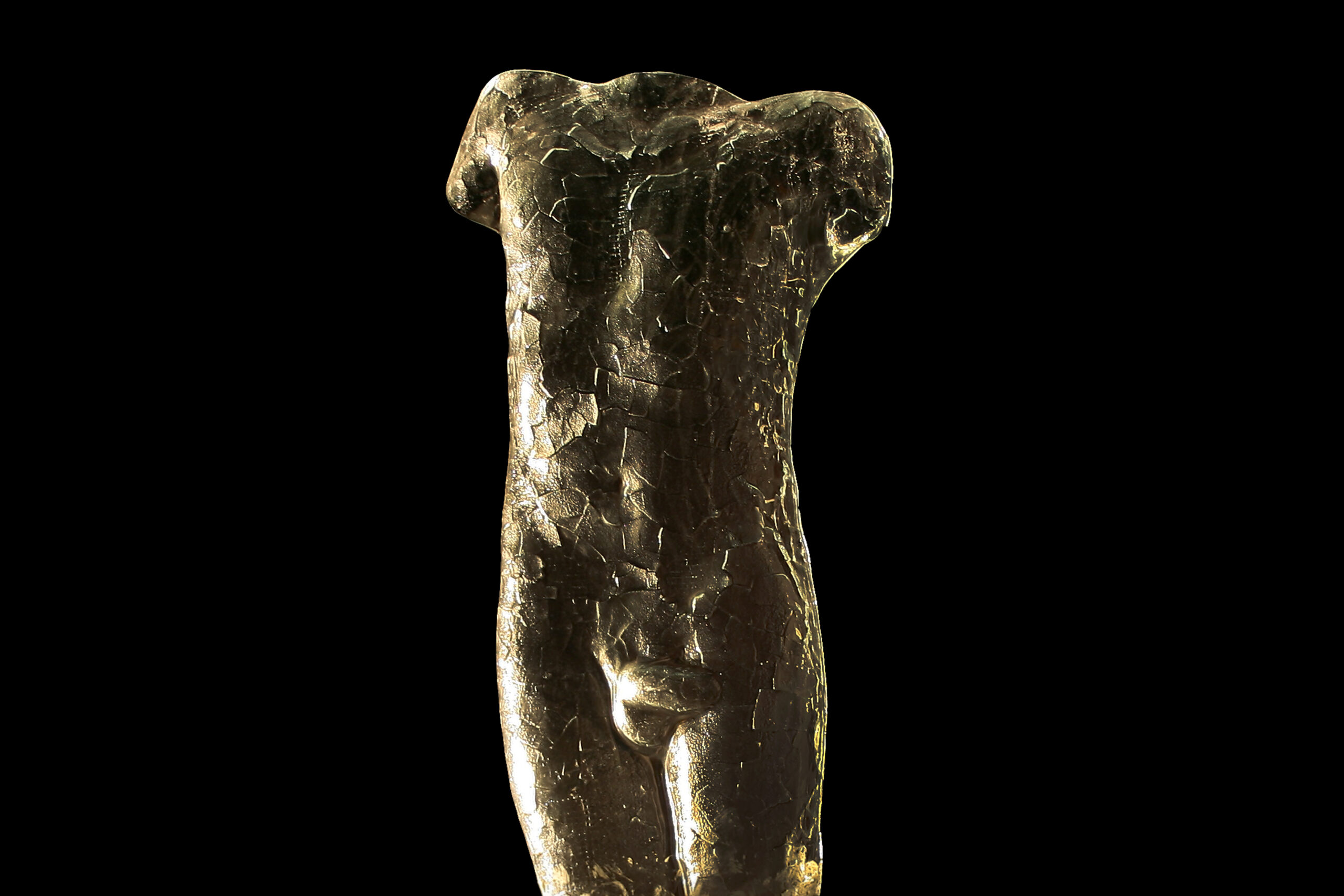 The beauty of the human body inspired Alana Kajfež to depict the realization of nudity, to stimulate the observer and their mind with a desire, with the charm that images of the naked female torso have on the human mind. The cycle of five glass torsos titled “Transparency” depicts casts of real people from the artist’s life. Using the sculptural technique of glass fusion, Alana portrays the beauty, harmony, and fragility of the female body. The fragility and translucency of the glass female torso, broken into fractals, remind us of the transience of life, beauty, tranquility, light, and darkness. Alana Kajfež elevates the relationship with the body from the divine to the ultimate means of achieving a goal by exploring its properties and possibilities. In contemporary times, the naked body is still considered provocative; its natural beauty is reduced to primordial nudity, which, according to Kant, becomes “infinitely imperceptible, infinitely devoid of mystery.” However, the nudity of Alana Kajfež’s glass torsos represents the unchanging beauty of the female body, always shrouded in a veil of mystery in the eyes of the artist and the observer, unlike a body devoid of all aesthetics, lacking beauty and exaltation, floating between the living and the artificial, between life and art.