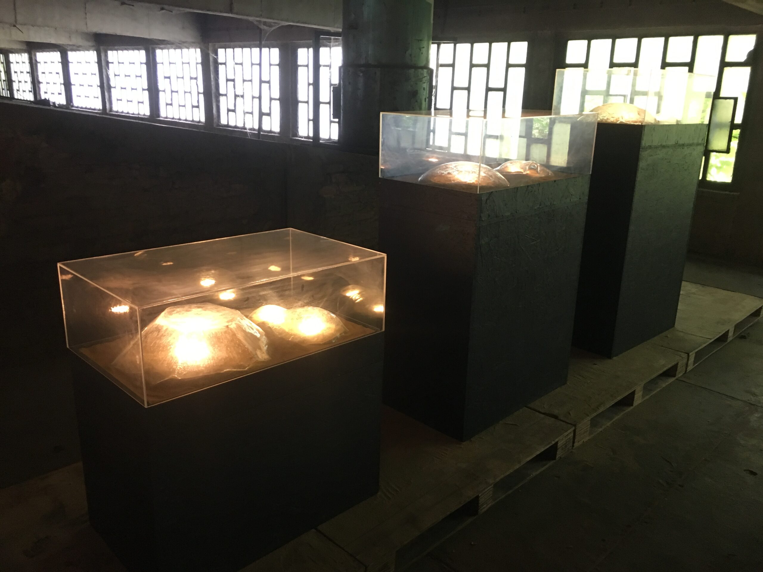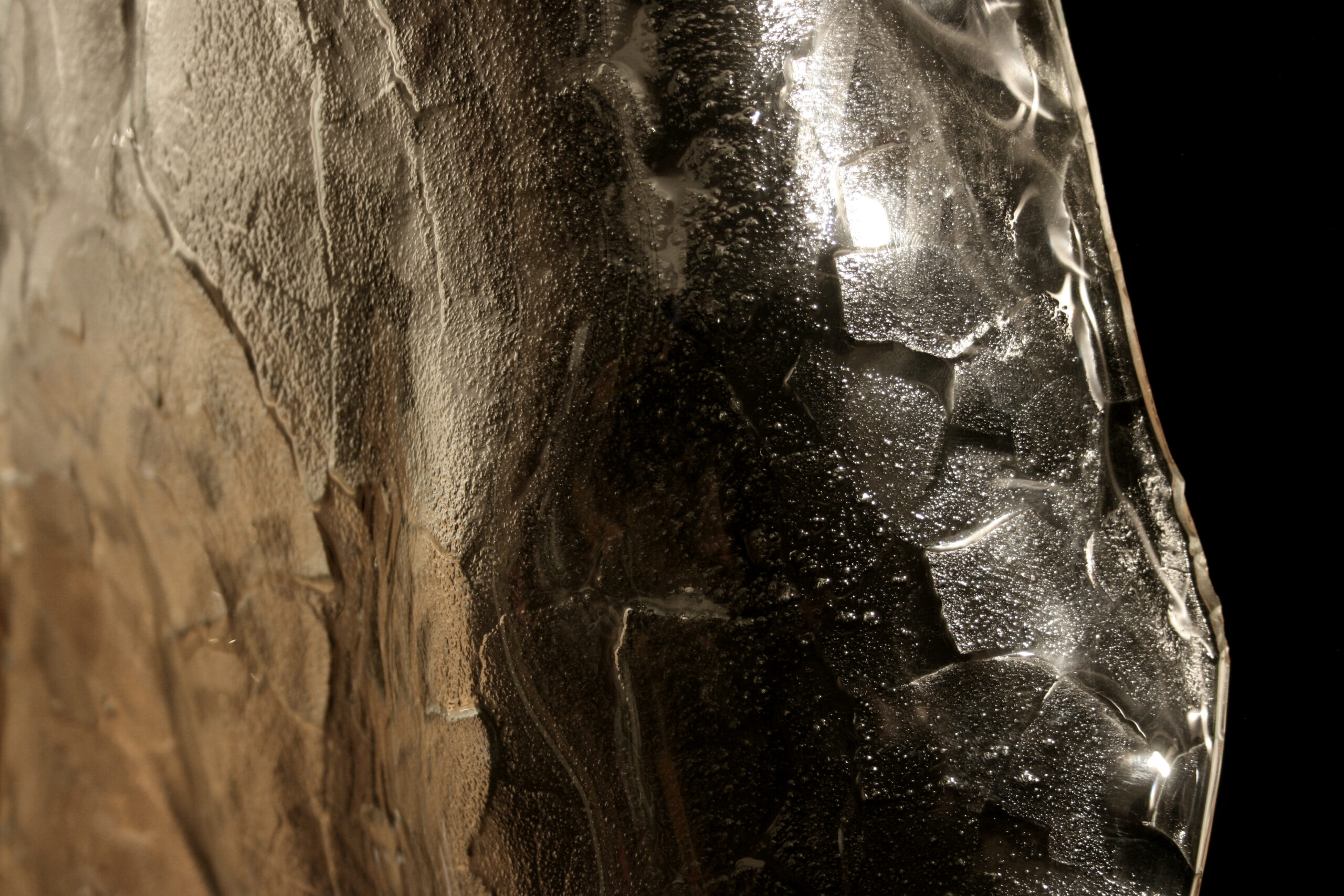 Sand symbolizes elemental matter (sand, earth, solid matter…), and glass represents transparency and the power of self-shaping (unplanned effects on glass during baking – crackle). These are connected or linked by light that passes through both – the energetic aspect of both contents. The glass shapes created by the fusion of glass depict the process from ethereal to crystalline form, which chemically and abstractly materializes the form (from crystalline to amorphous and amorphous to crystalline).